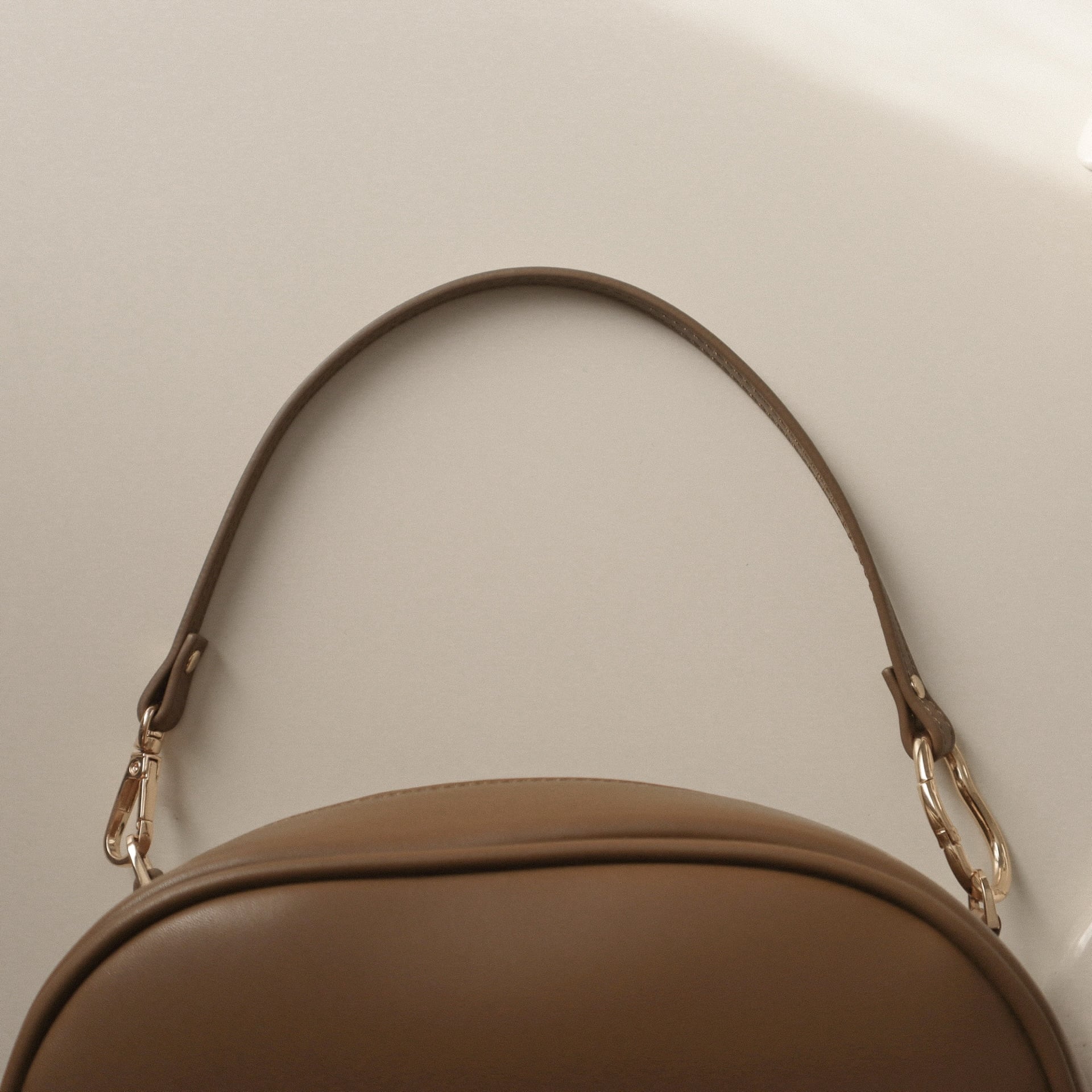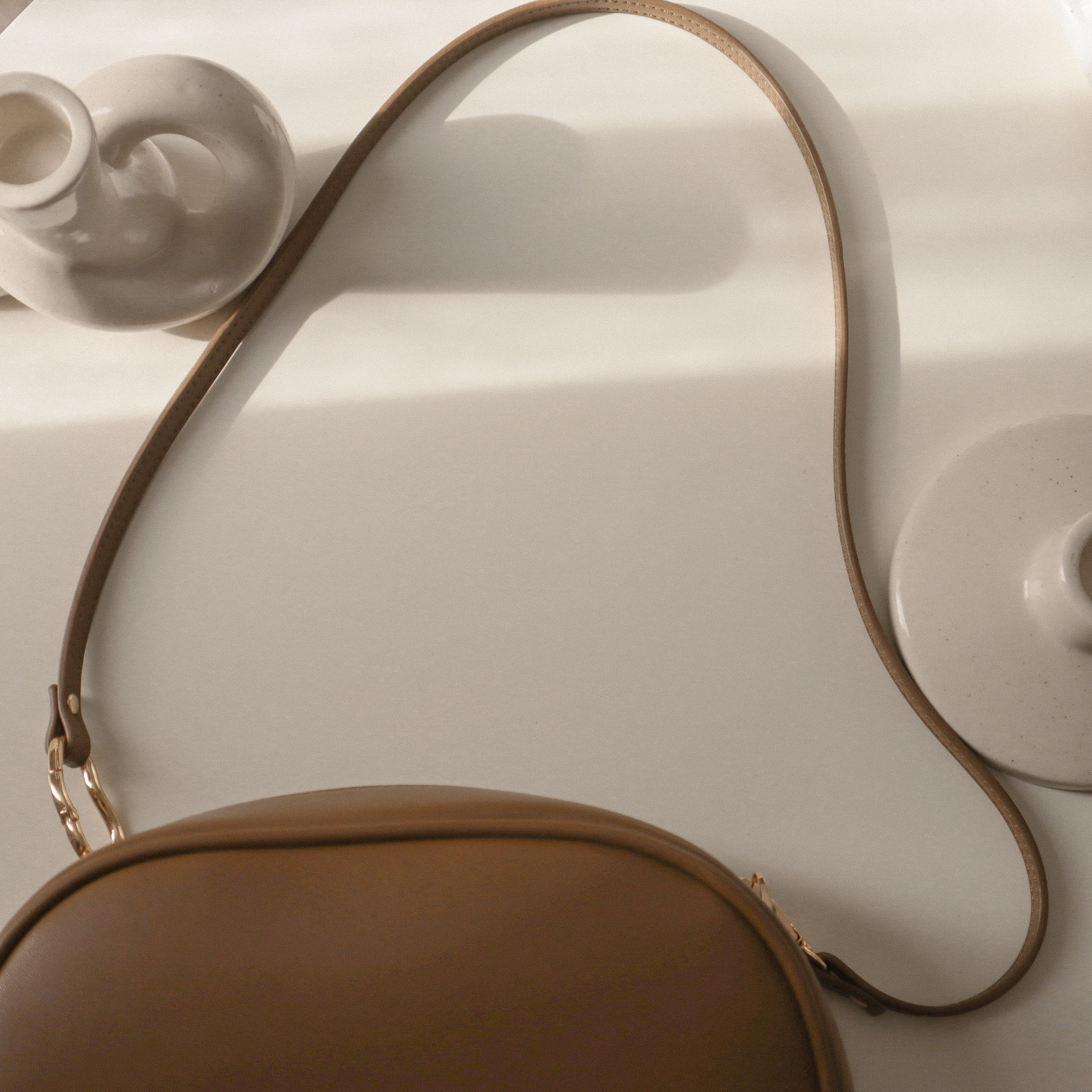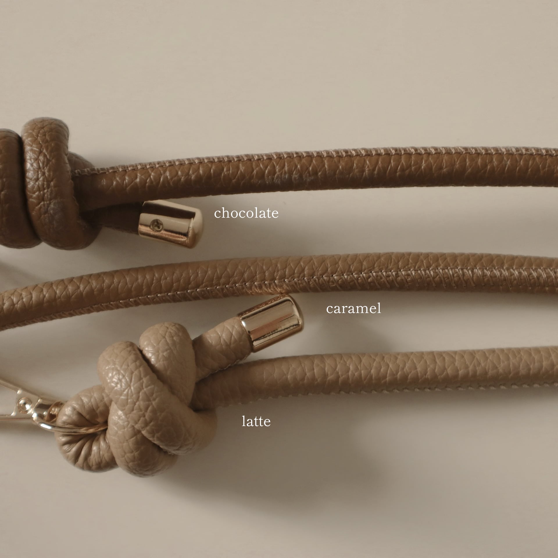 knot leather ¥2,590 高級感のあるしっかりとした生地で出来たショルダーストラップ。結び目もさりげなく、大人可愛くご使用いただけます。