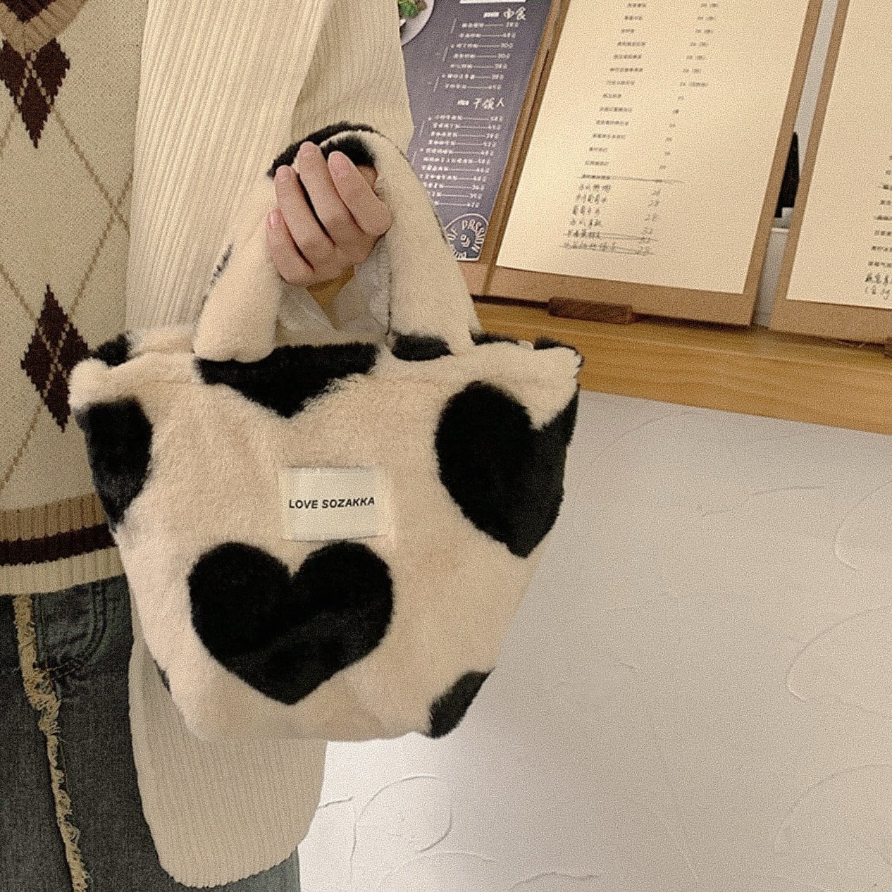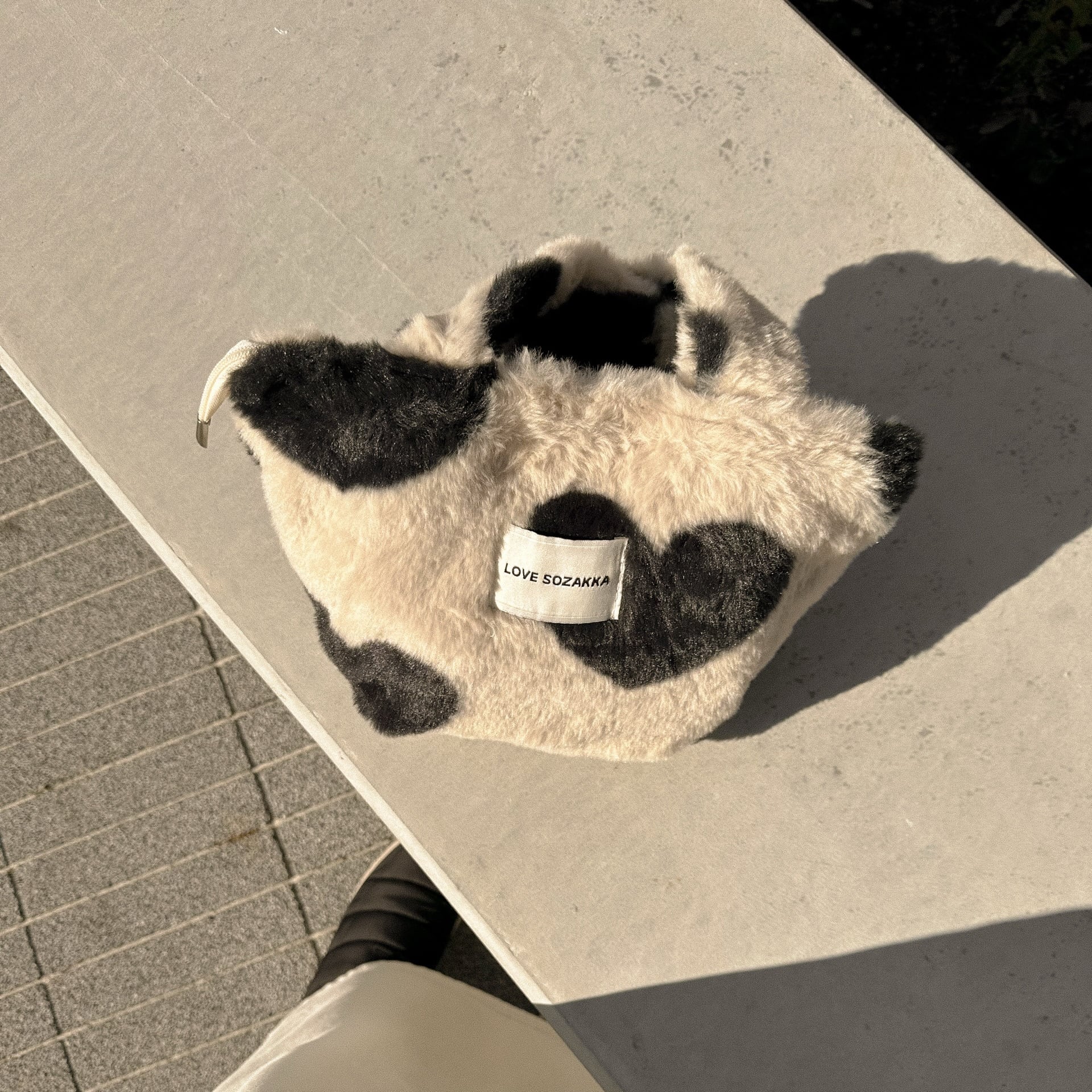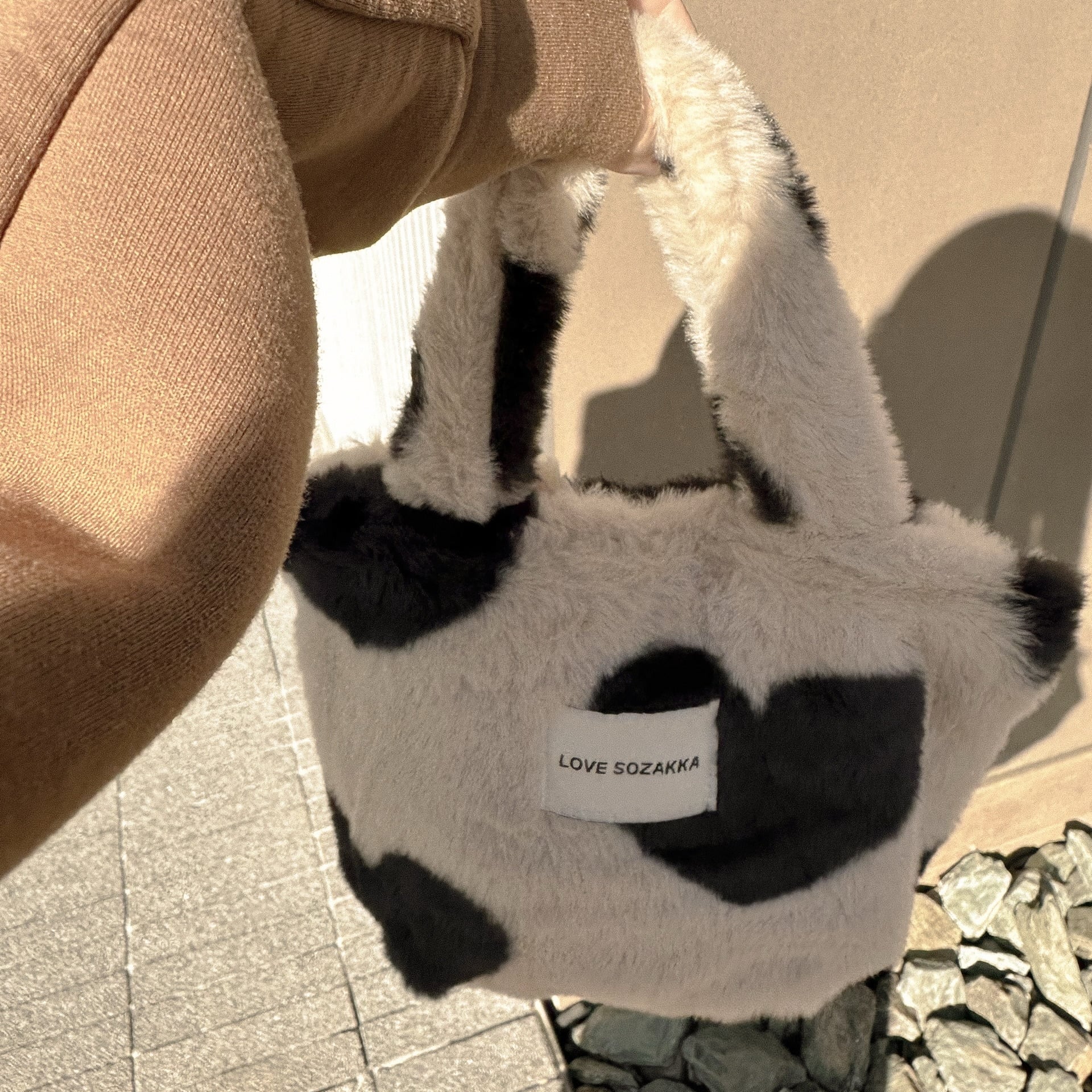 ふわふわ感とモノトーンハートが可愛過ぎる、ハンドバッグ。意外と大容量なので、秋冬のお出かけにぴったりです♩