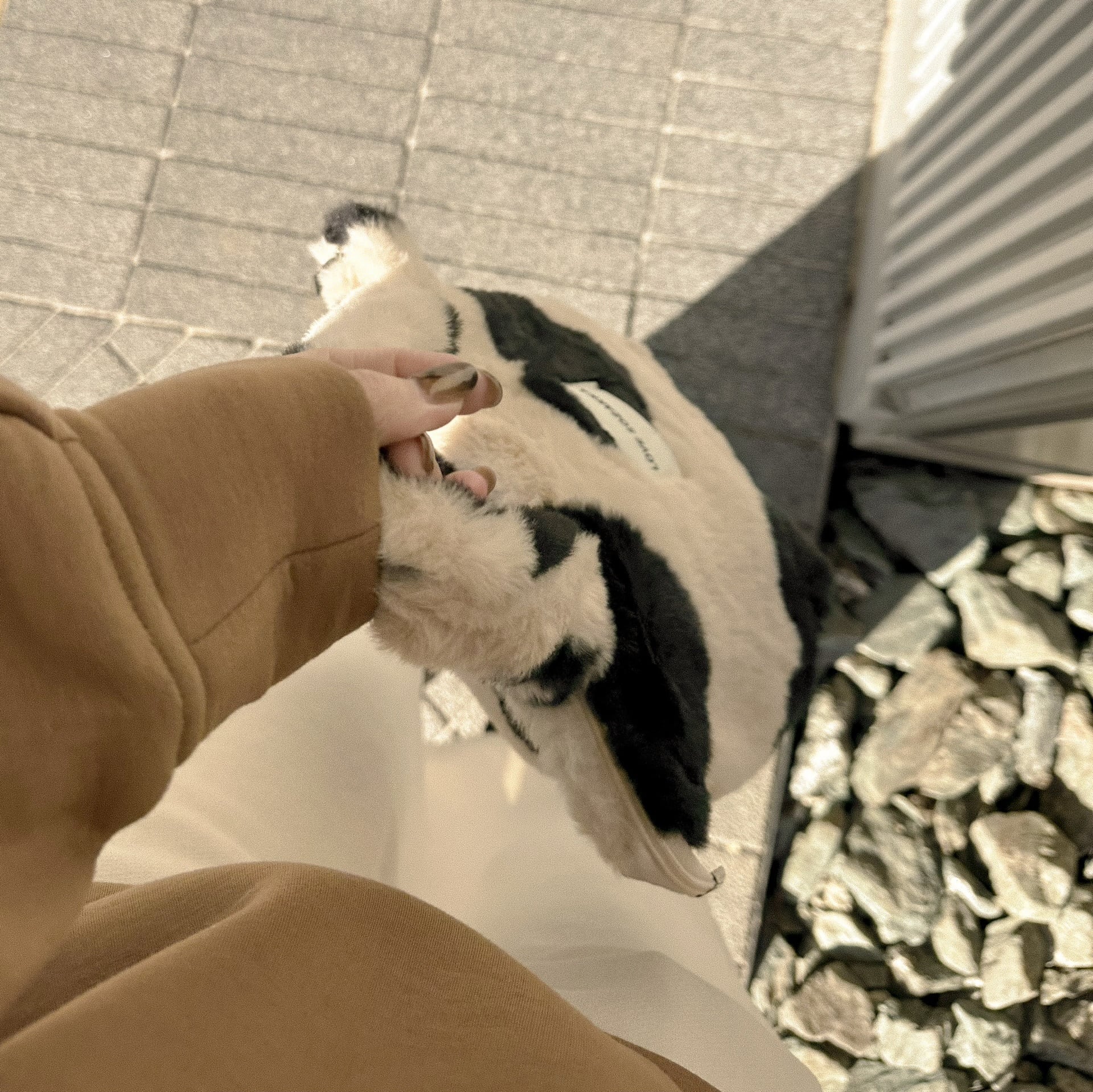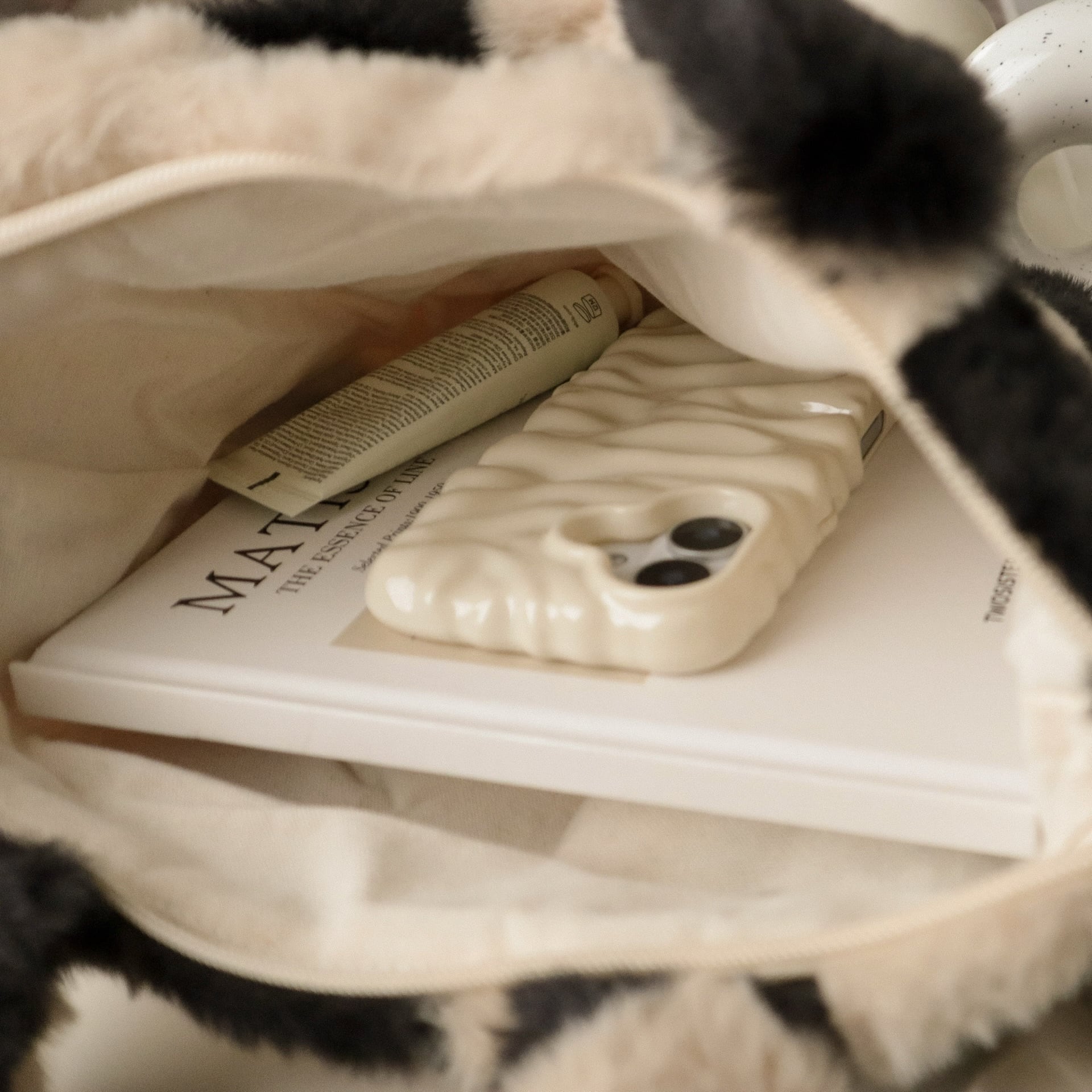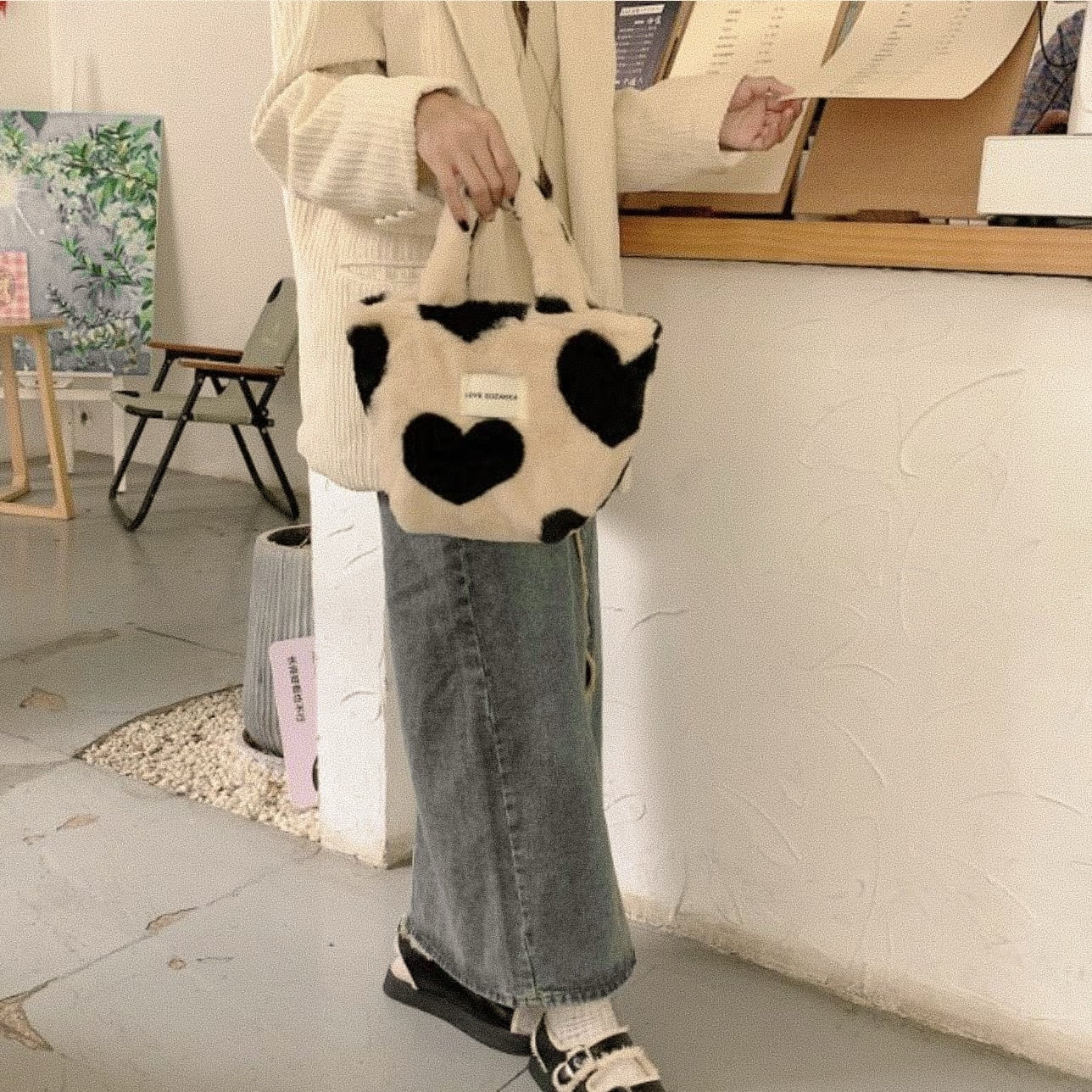 ふわふわ感とモノトーンハートが可愛過ぎる、ハンドバッグ。意外と大容量なので、秋冬のお出かけにぴったりです♩
