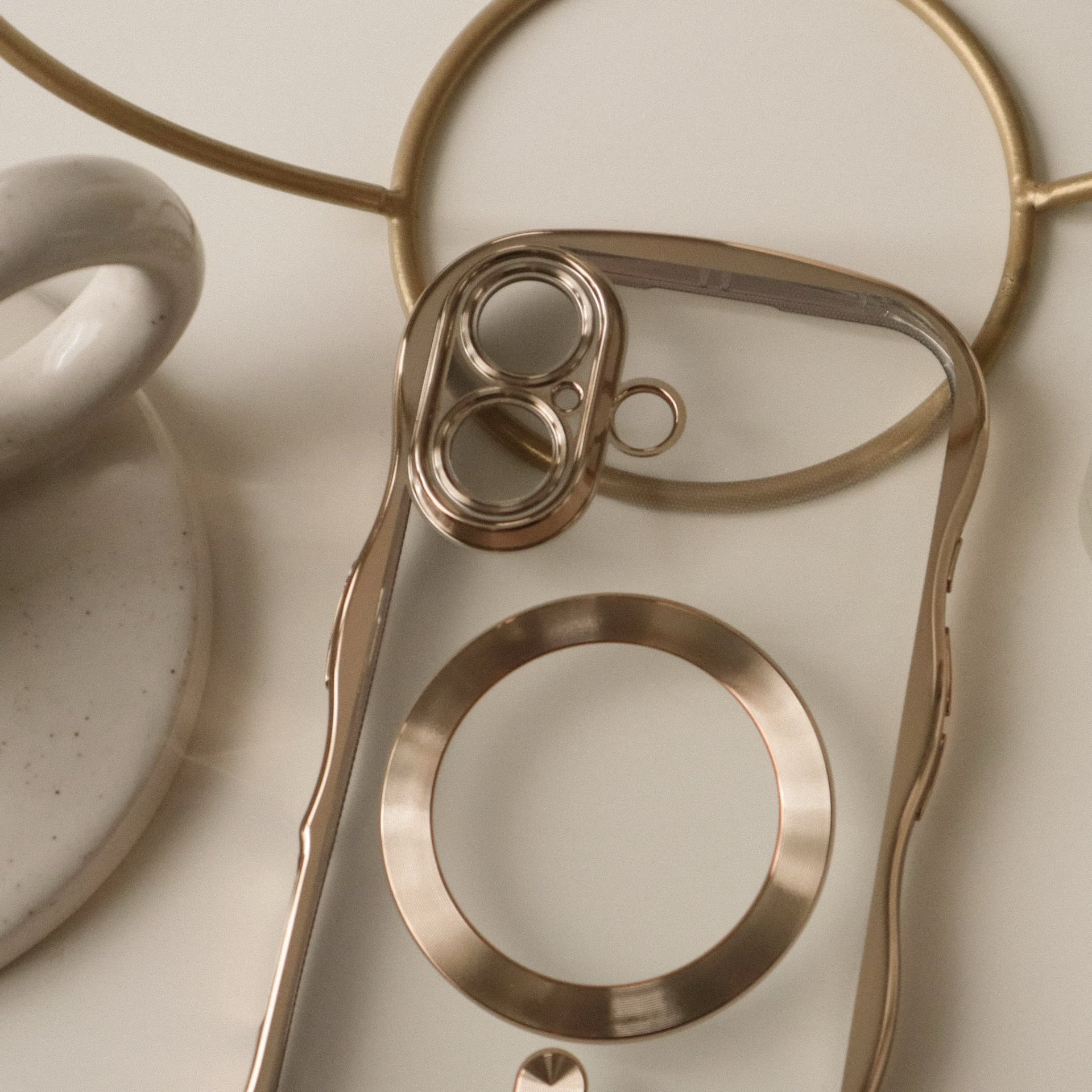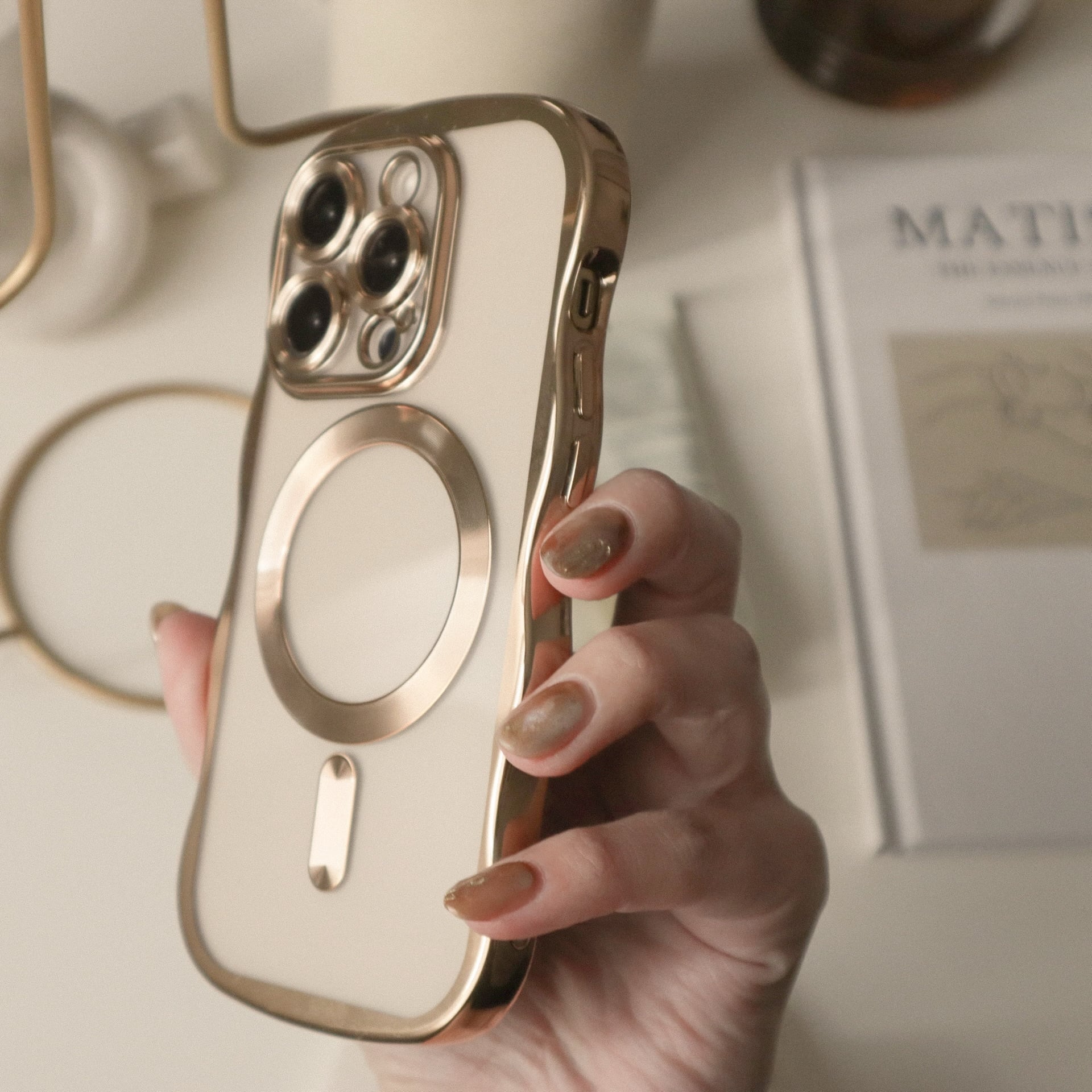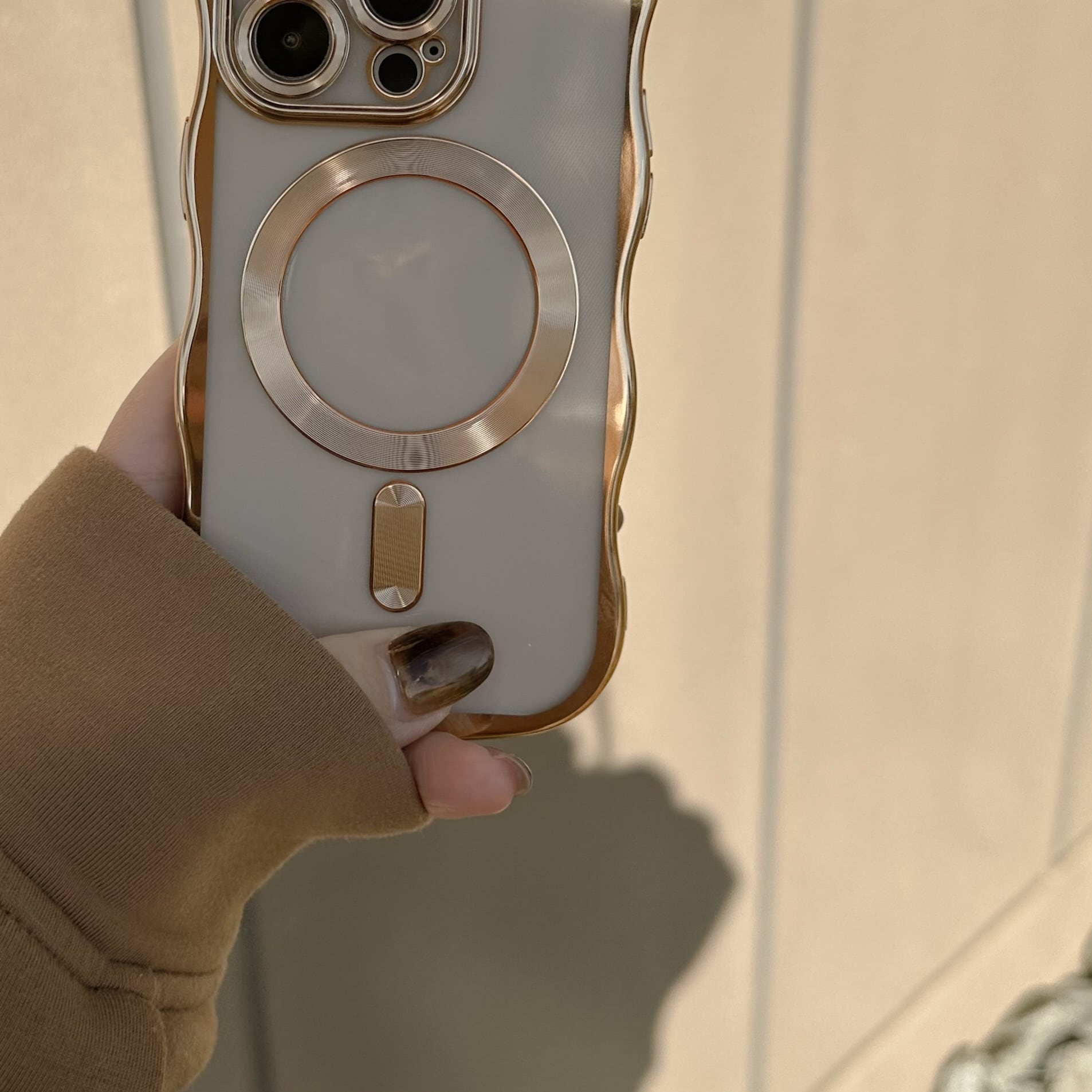 ゴールドウェーブフレームが可愛い、保護力高めのクリアケース。カメラコントロールボタンにも傷を付けたくない方にお勧めです♩