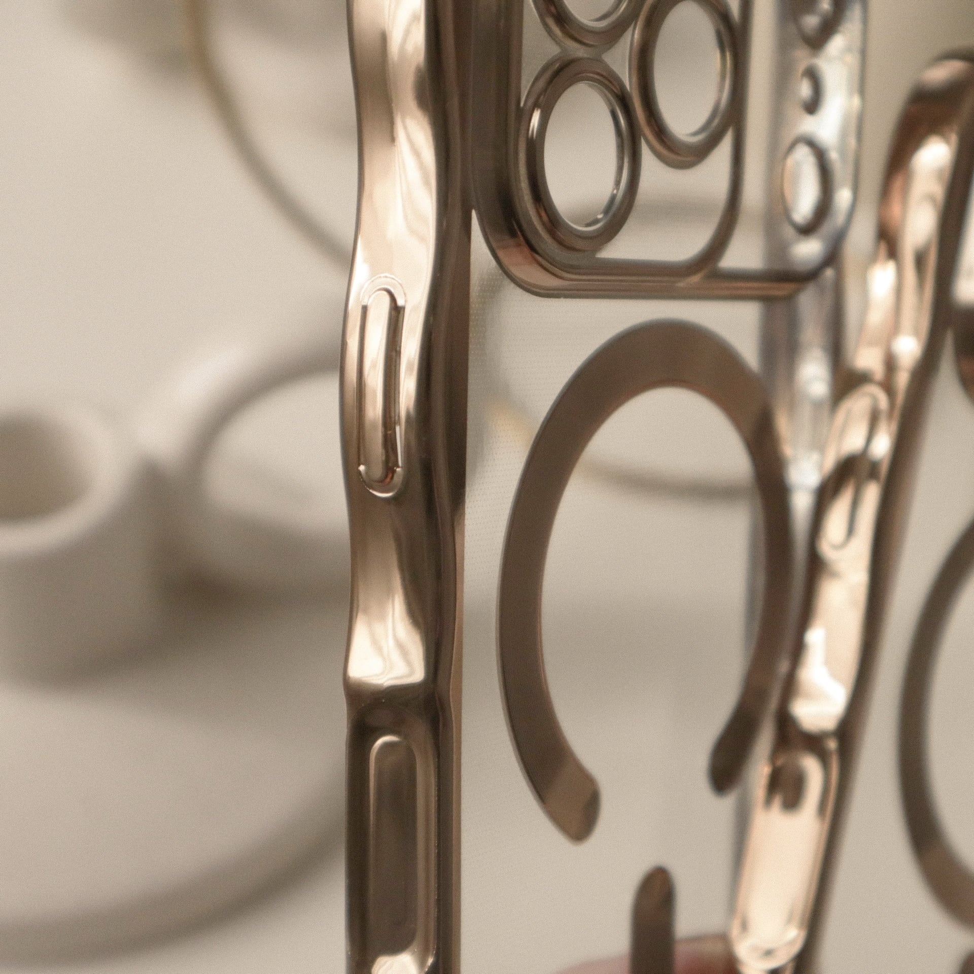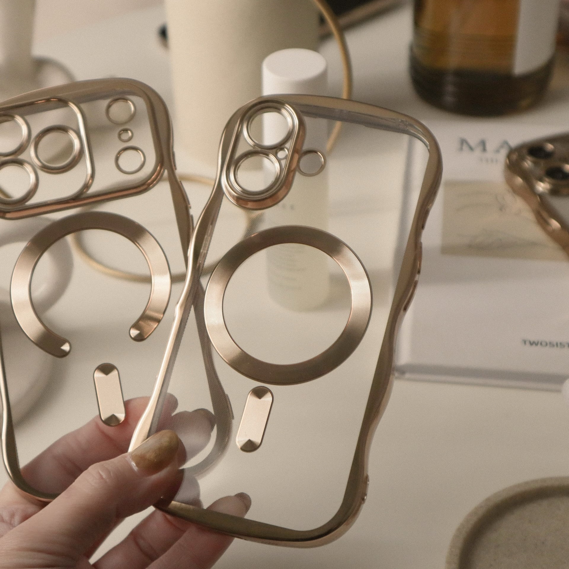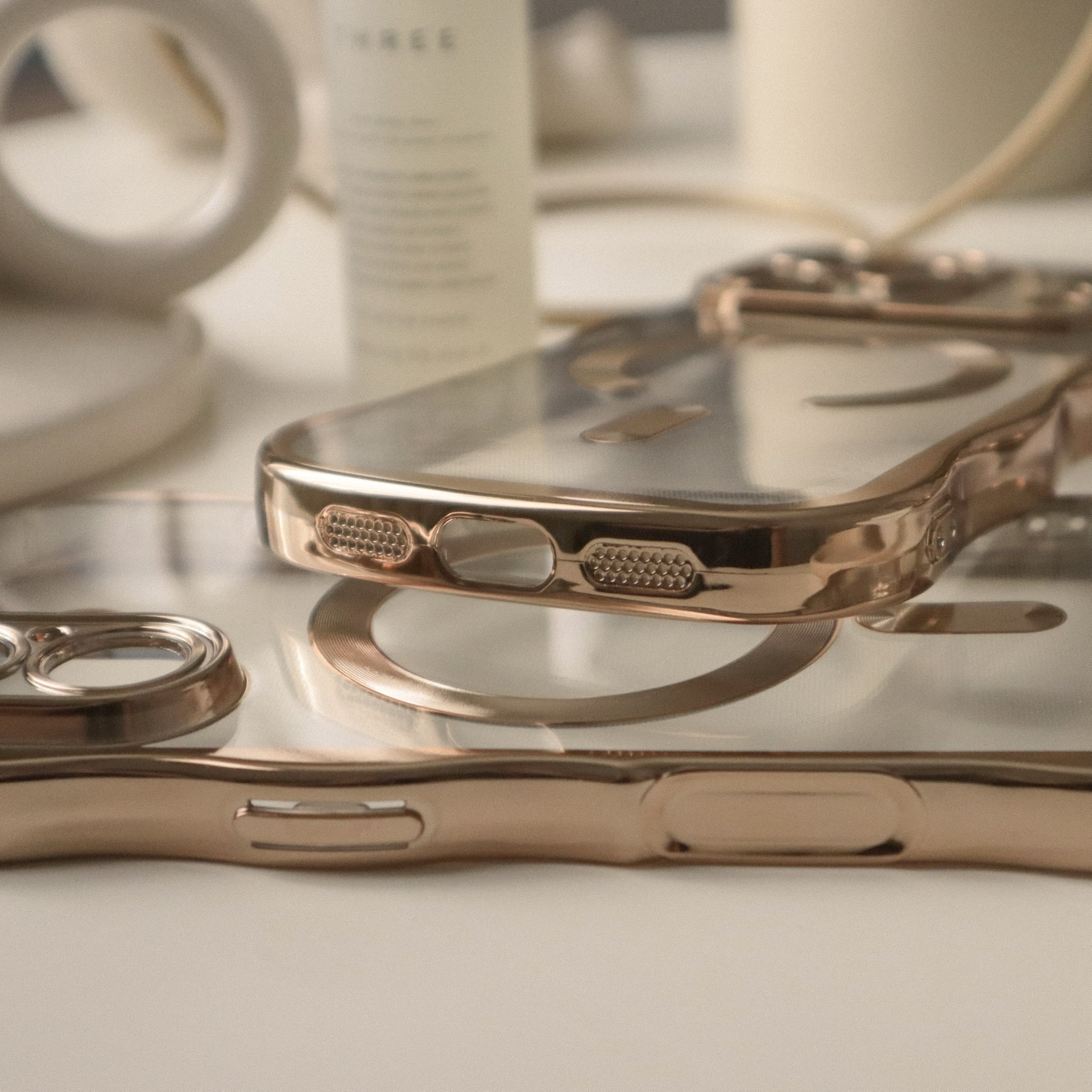 ゴールドウェーブフレームが可愛い、保護力高めのクリアケース。カメラコントロールボタンにも傷を付けたくない方にお勧めです♩