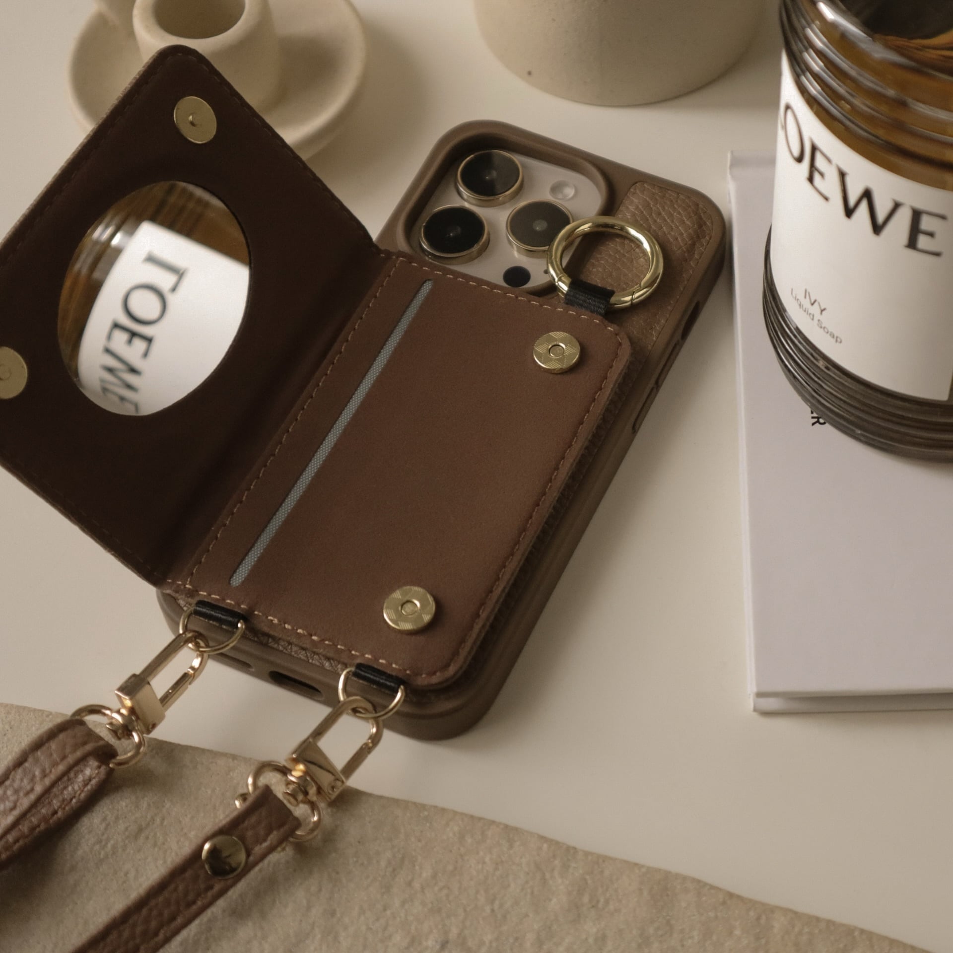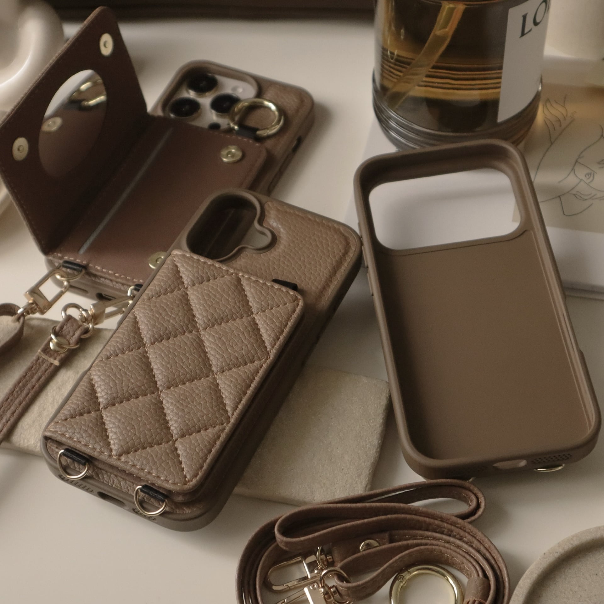 キルティングでも可愛くなり過ぎず、大人なデザインの多機能ケース。ミラー付きでカードも入り、リング・ストラップ付きです♩