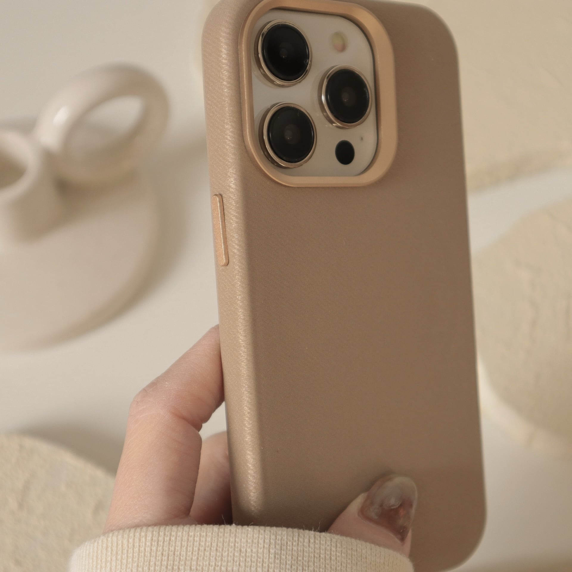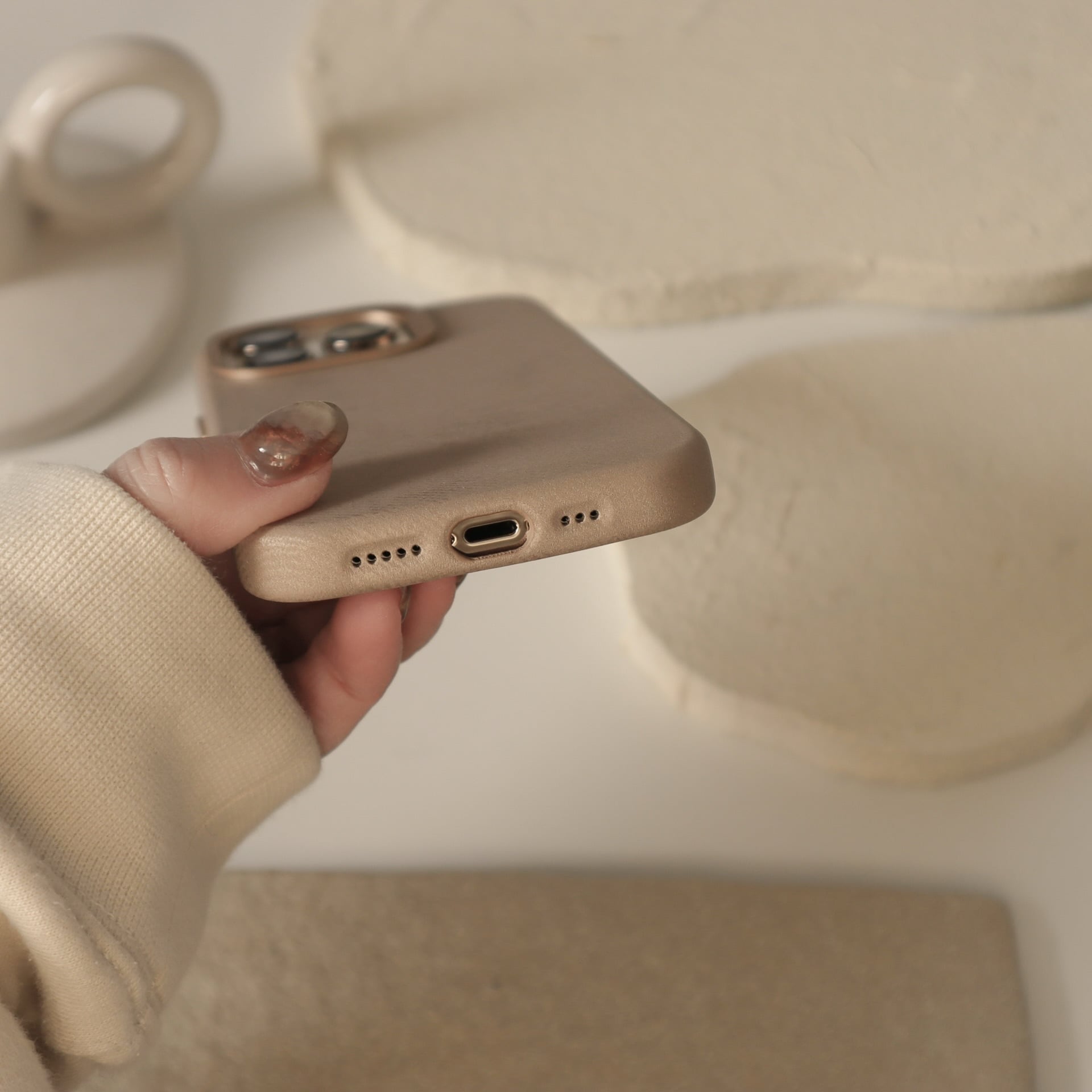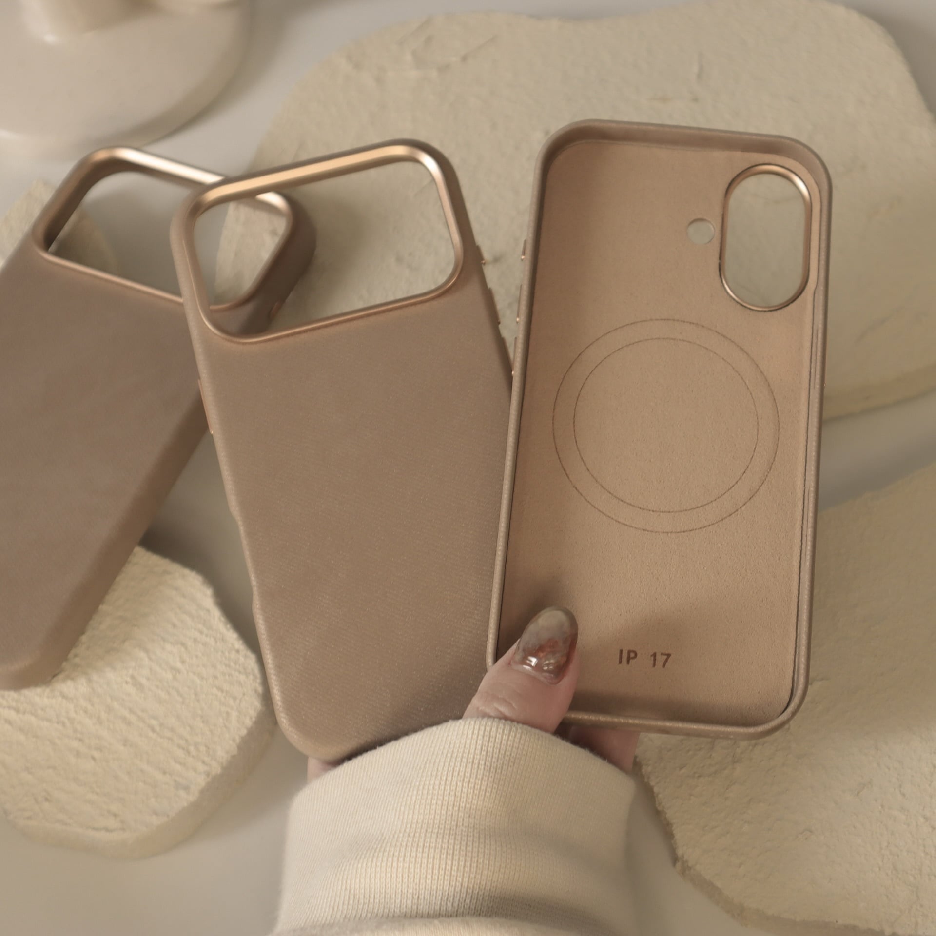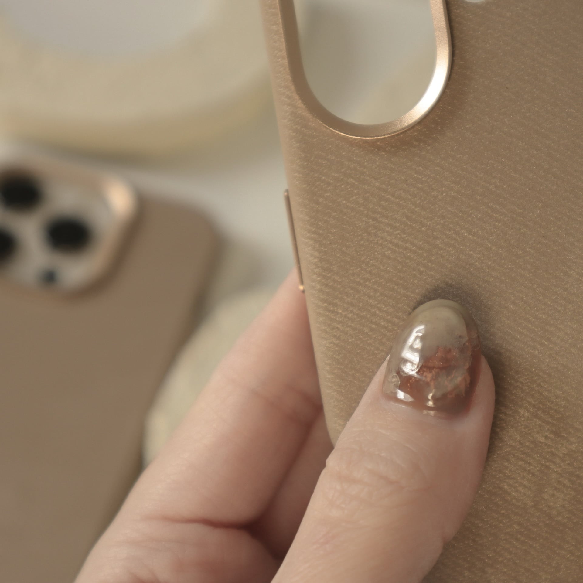 マットゴールドのカメラフレームが可愛く、触り心地の良いベロア素材のケースです。MagSafe線が表面に出ていないためシンプルなデザインなのも◎