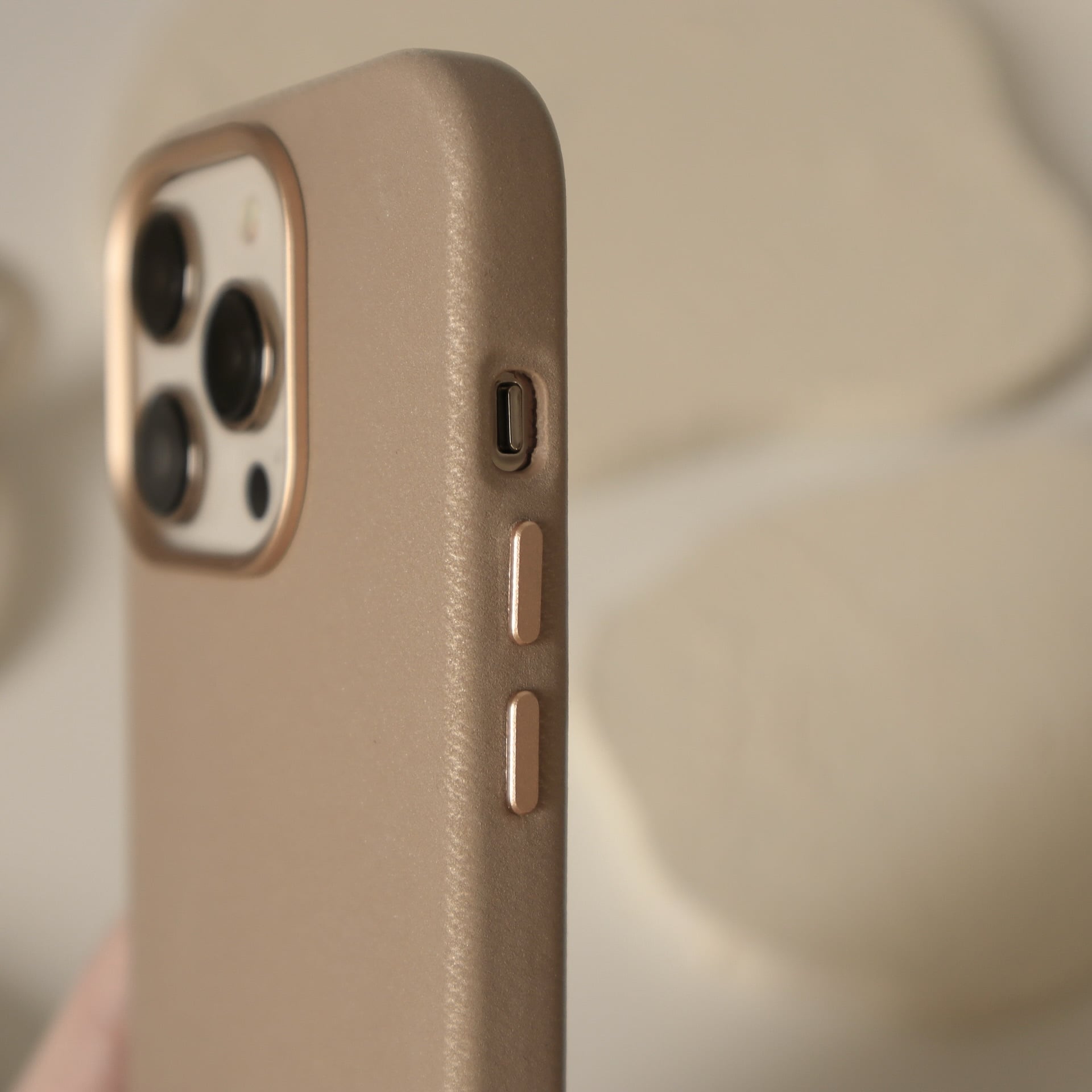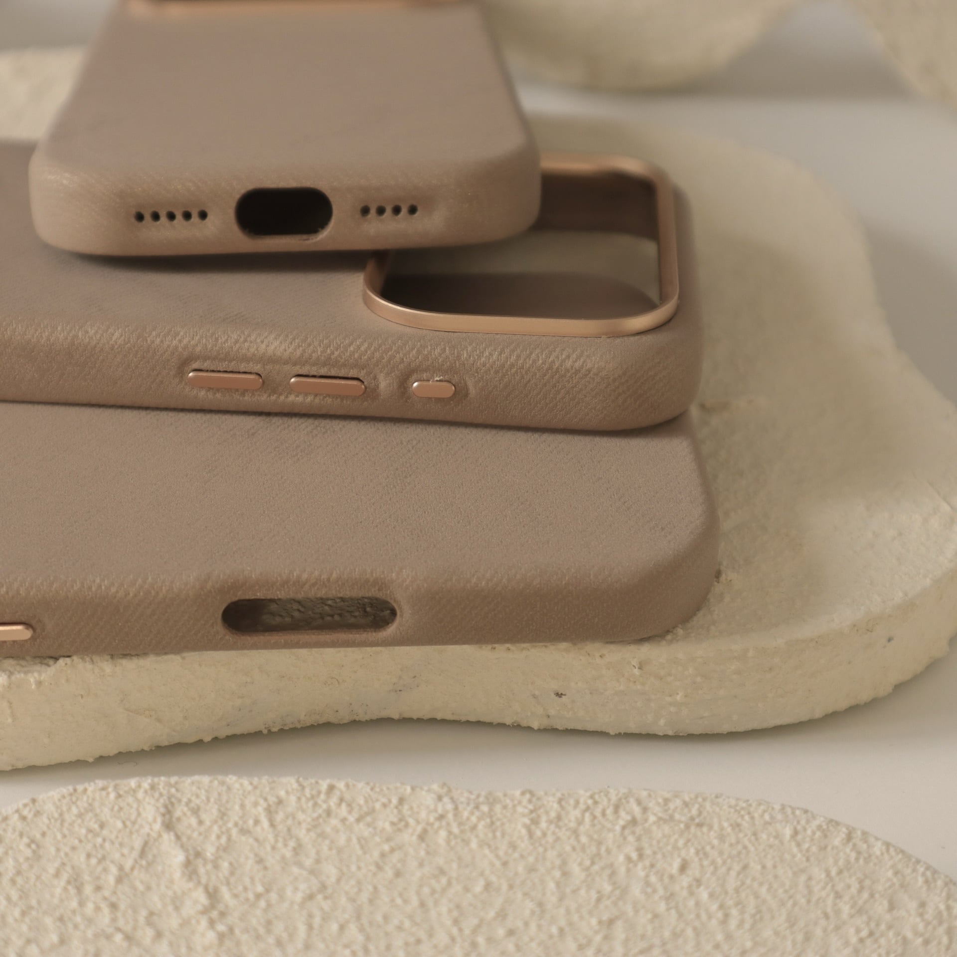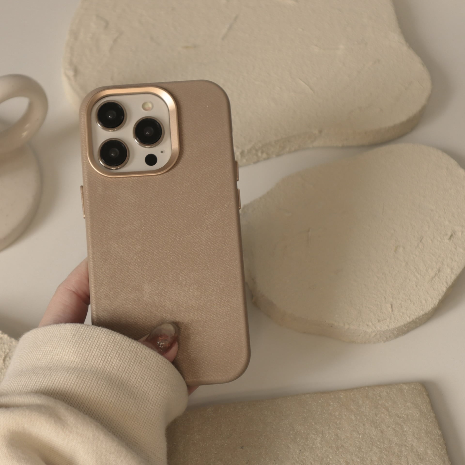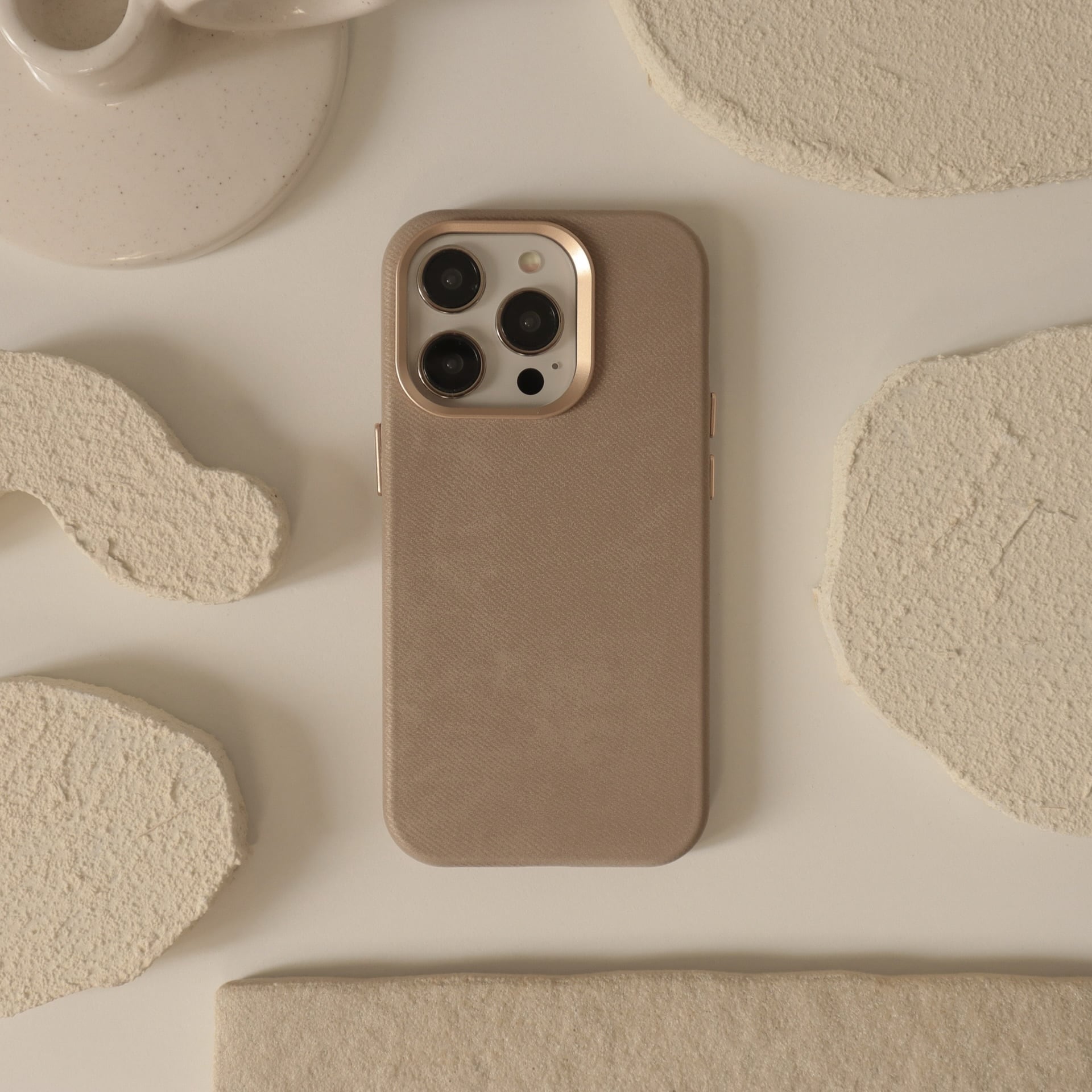 マットゴールドのカメラフレームが可愛く、触り心地の良いベロア素材のケースです。MagSafe線が表面に出ていないためシンプルなデザインなのも◎