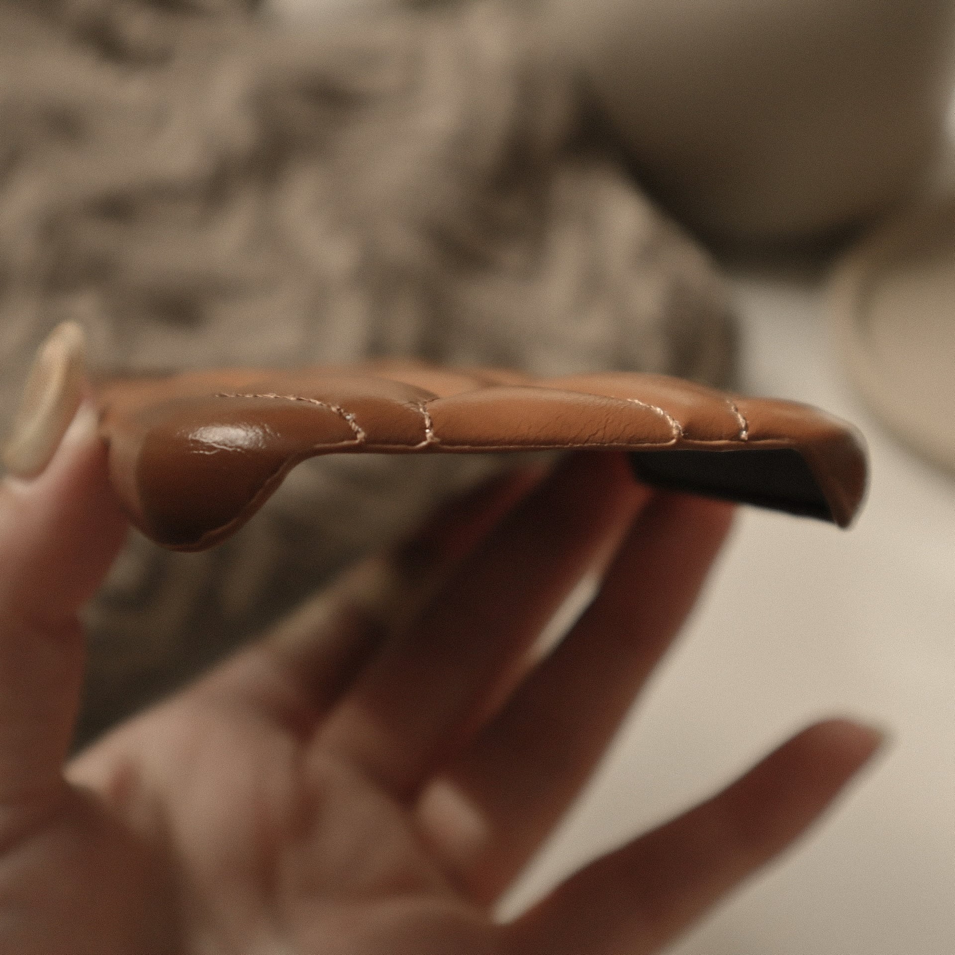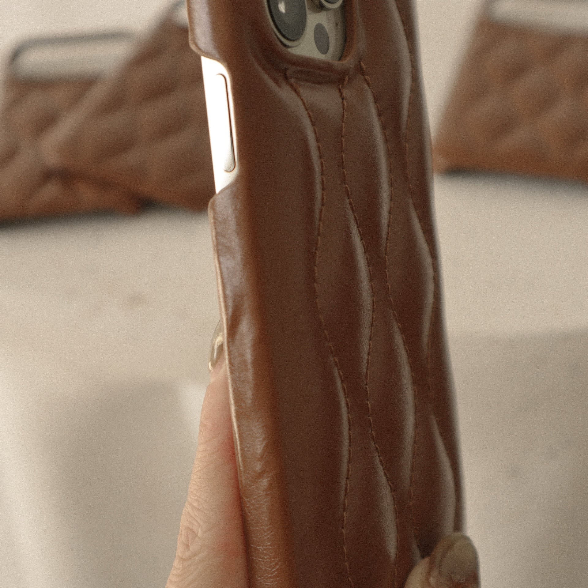 赤みのあるブラウン、そして艶のある生地が大人な雰囲気を醸し出すキルティングケースです。ボタン部も開口になっているため押しづらさ無しです♩