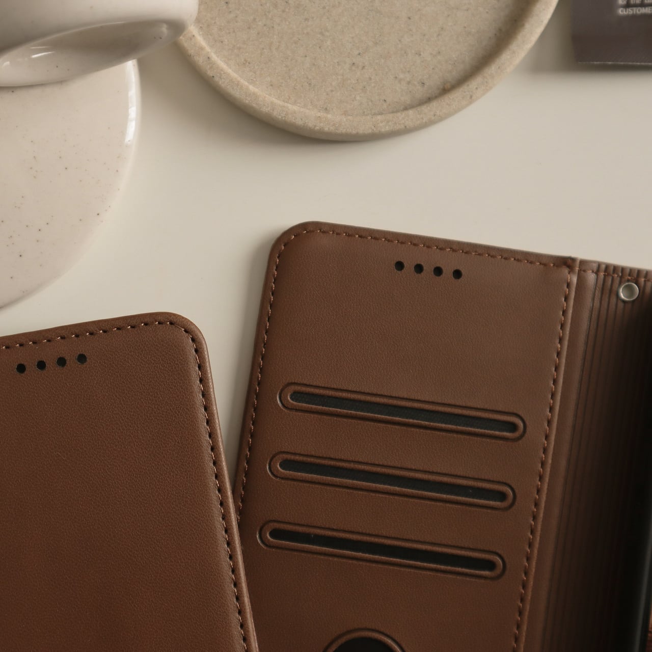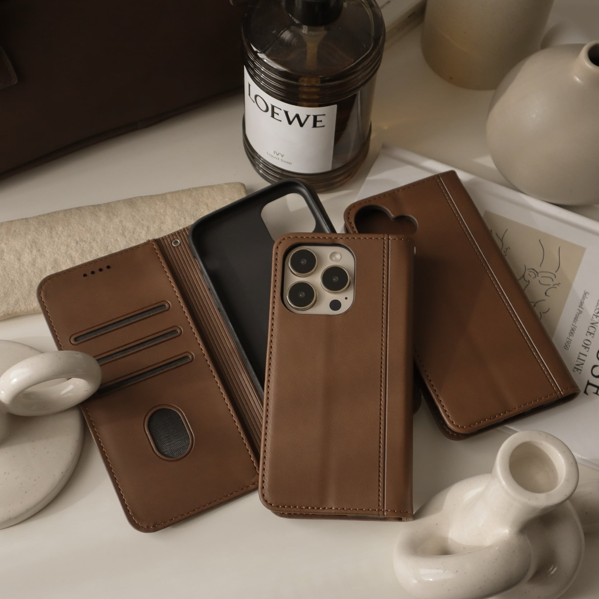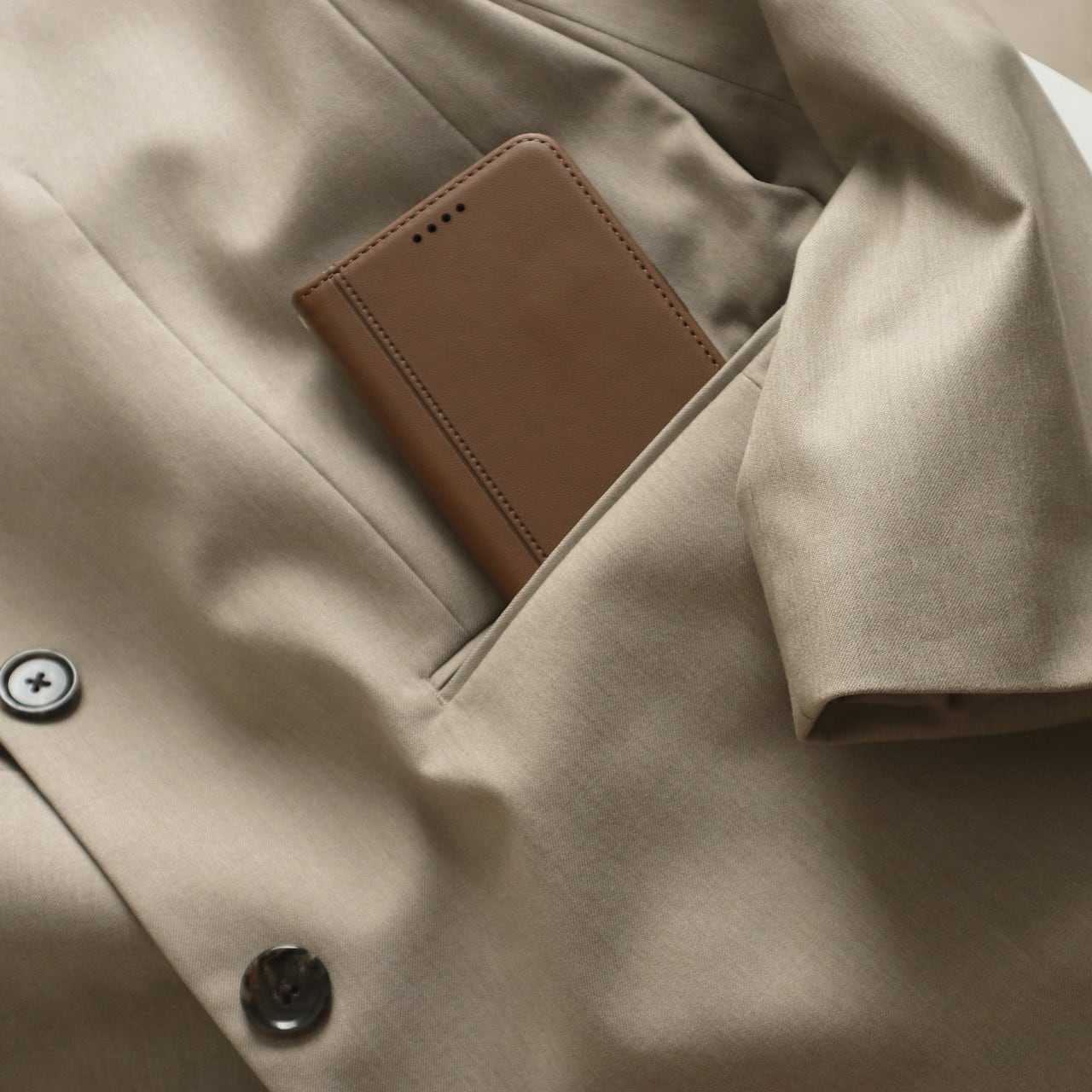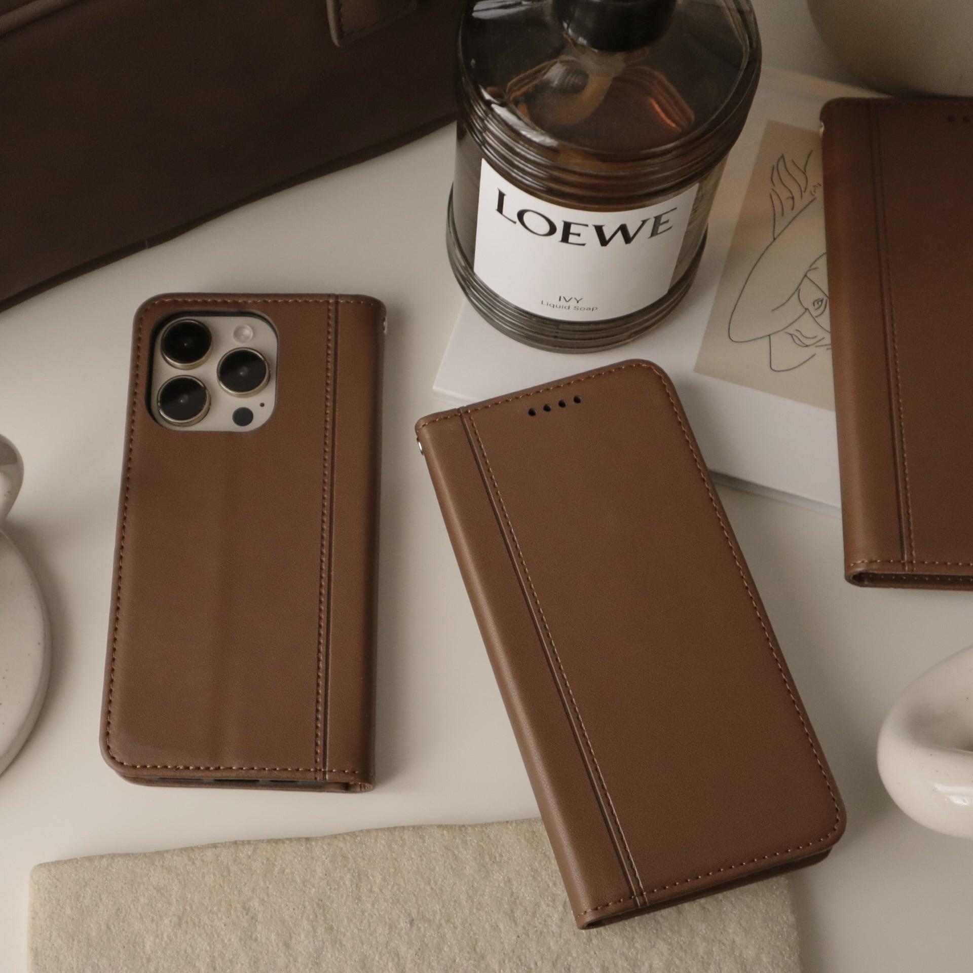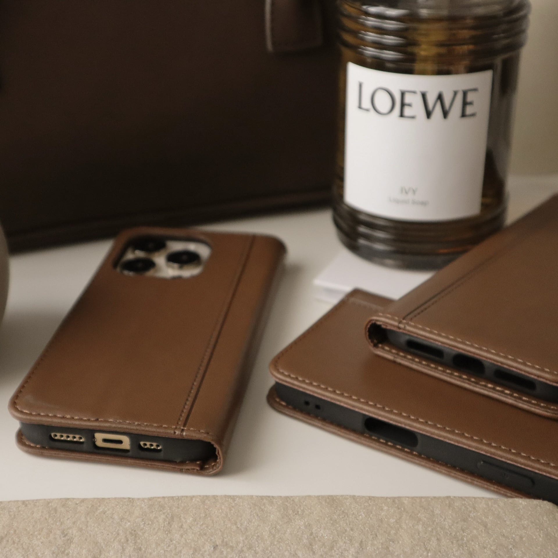 チョコブラウンの色味が可愛過ぎる、大人っぽい印象の手帳型ケースです。見た目良し、画面の保護力良し、サイズ展開も豊富◎
